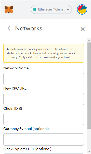 5- Click on Networks, select ‘Custom RPC’ and you should see this menu pop up: