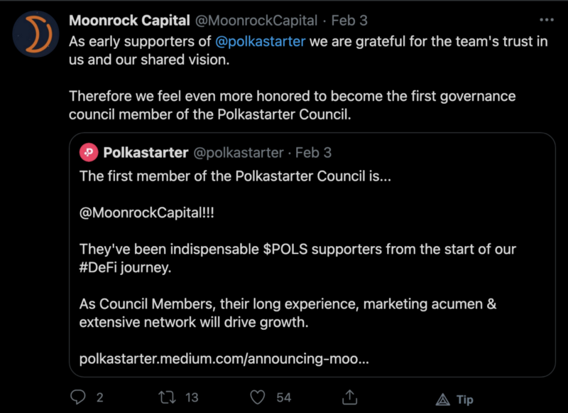 The first batch of members will be fully focused on institutional funds that can bring value to the projects that are raising on Polkastarter. We actually already announced the first member, Moonrock Capital.