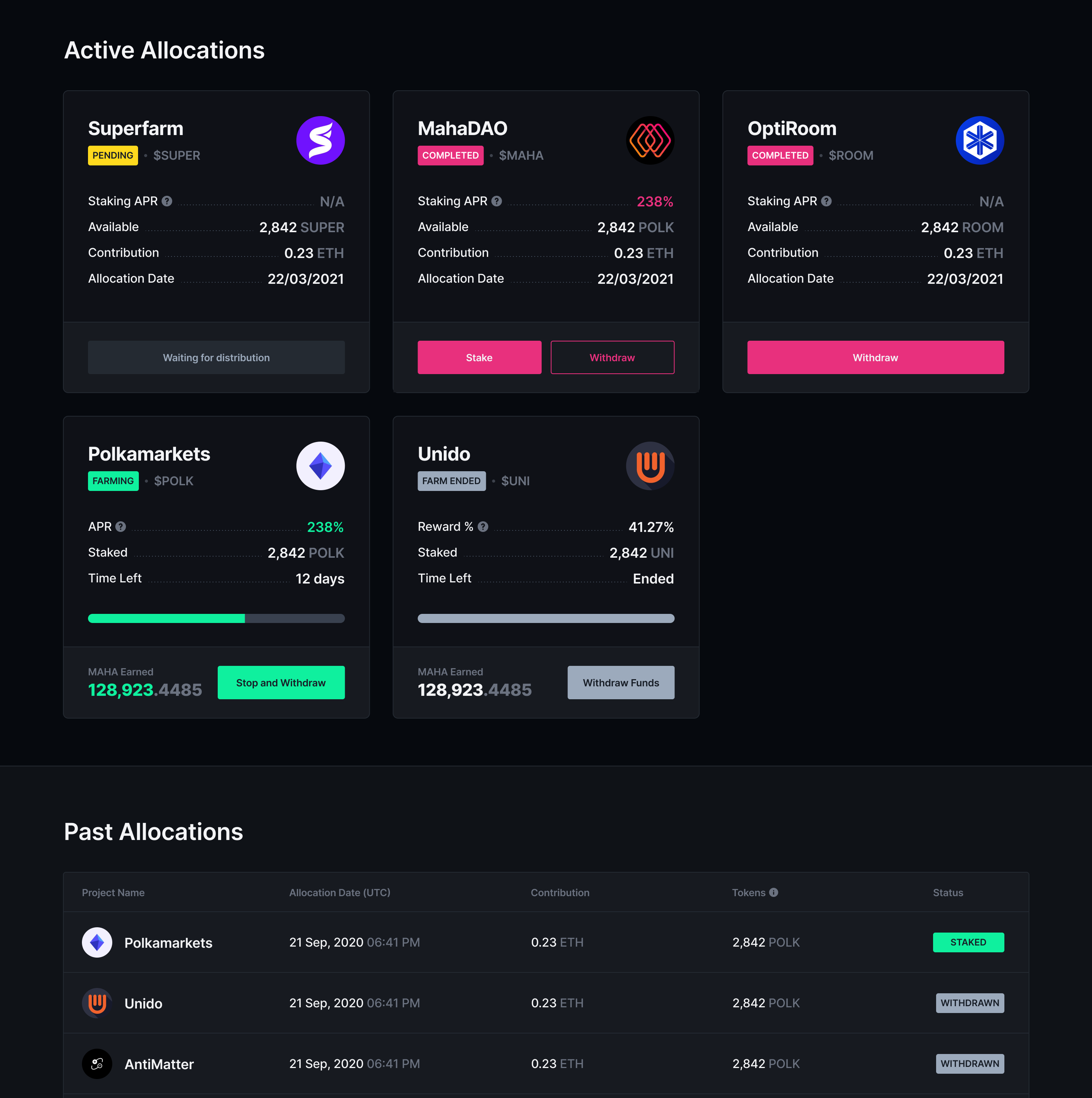 The new Allocations page gives you an overview of all the IDOs you currently are or have participated in, including information on the amount of your contributions and other useful things such as distribution status, staking and farming.